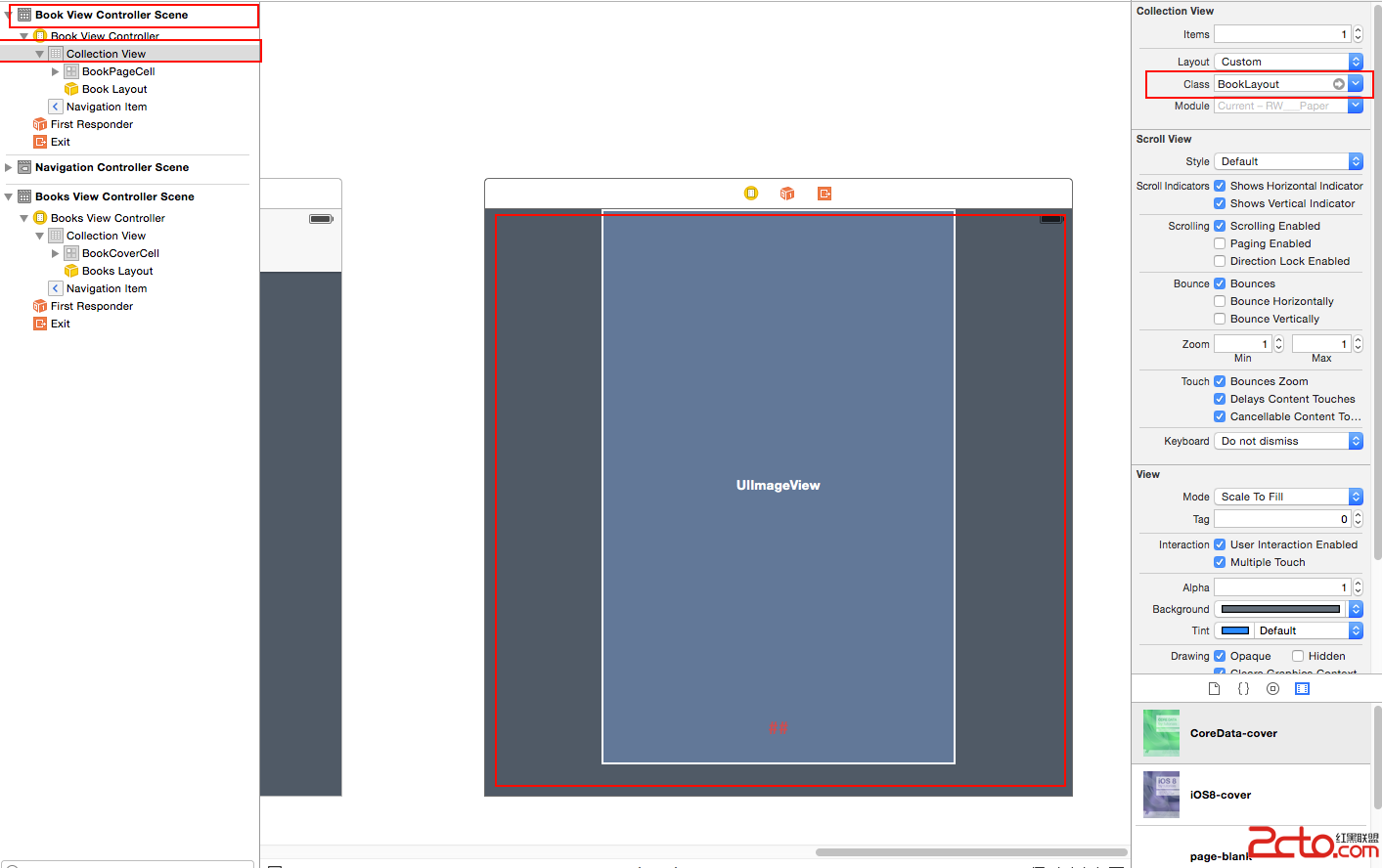 同前面一樣,圖書所使用的Collection View需要適用新的布局。打開Main.storyboard,然後選擇Book View Controller場景,展開並選中其中的Collection View,然後設置Layout屬性為Custom。