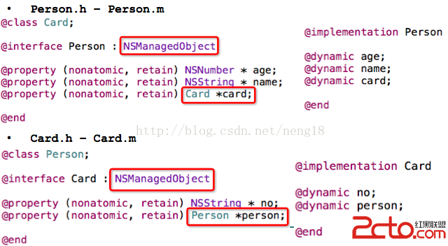 傳入上下文,創建一個Person實體對象 NSManagedObject *person = [NSEntityDescription insertNewObjectForEntityForName:@"Person" inManagedObjectContext:context]; 設置簡單屬性 [person setValue:@"MJ" forKey:@"name"]; [person setValue:[NSNumber numberWithInt:27] forKey:@"age"]; 傳入上下文,創建一個Card實體對象 NSManagedObject *card = [NSEntityDescription insertNewObjectForEntityForName:@"Card" inManagedObjectContext:context]; [card setValue:@"4414241933432" forKey:@"no"]; 設置Person和Card之間的關聯關系 [person setValue:card forKey:@"card"];
