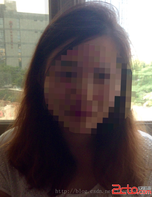 這上面的代碼基本是復制上一篇裡的代碼,改的地方只有兩處:把馬賽克的效果變大,kCIInputScaleKey默認值為0.5,你可以把這行代碼注釋掉後看效果計算臉部的中心點和半徑,計算方法和之前didOutputMetadataObjects這個delegate回調中的計算方法一樣,復制過來就行了如果你看到我的上一篇《iOS8 Core Image In Swift:人臉檢測以及馬賽克》的話,這裡面的實現方式應該就很清楚了。到此,對臉部的濾鏡也處理好了,編譯、運行,可以得到這樣的結果: