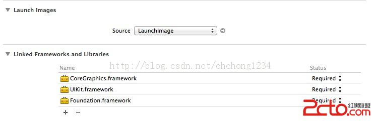 5. Linked Frameworks and Libraries 點擊“+”號或者“-”號,可以為應用程序添加和移除系統庫。