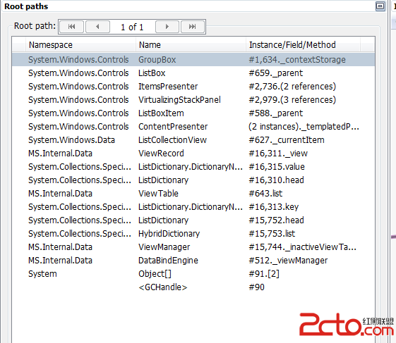 圖2表示GroupBox._contextStorage保存了我的GroupControl;ListBox._parent保存了前面的GroupBox; ItemsPresenter保存了前面的ListBox;以此類推。因為有對GroupControl的引用鏈存在,所以它無法被垃圾回收。
