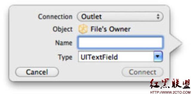 選擇first name文本框,右鍵(CTRL+左鍵)拖到interface聲明部分,將彈出一個popup窗口,在name中輸入firstNameTextField,然後點擊connect。