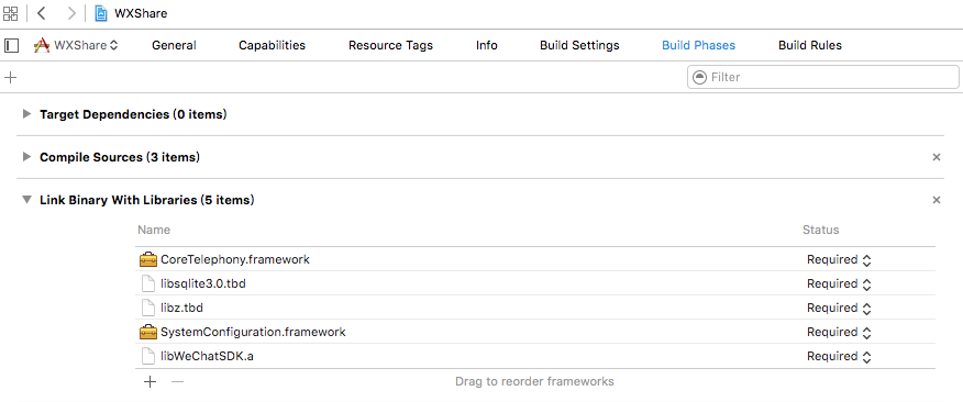 3.在工程Build Phases -> Link Binary With Libraries 鏈接以下動態庫和框架文件