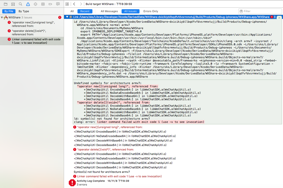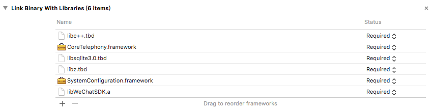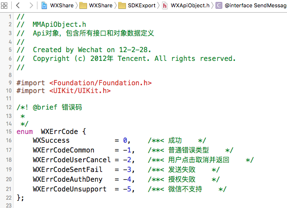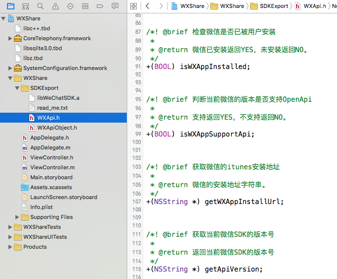 將下載下來的SDKExport文件夾導入到工程,其中包含3個核心文件libWeChatSDK.a WXApi.h WXApiObject.h(強烈建議大家看看read-me文件)