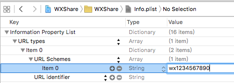 當分享完成後會回到APP 調用最開始注冊的"wx1234567890"為URL Scheme,因此也應該把此key添加到當前工程的URL Scheme(否則無法跳轉回到原APP)