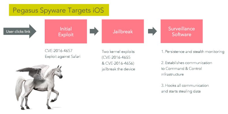 1. PEGASUS 三叉戟攻擊鏈:該攻擊鏈是在對阿聯酋的一位人權活動家進行apt攻擊的時候被發現。整個攻擊鏈由三個漏洞組成:JSC遠程代碼執行(CVE-2016-4657),內核信息洩露(CVE-2016-4655),內核UAF代碼執行(CVE-2016-4656)。