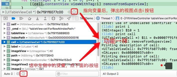 (lldb) po cell.contentView.subviews <__NSArrayM 0x60800005f5f0>( <UILabel: 0x7f91f4f18c90; frame = (5 5; 300 25); text = '2 - Drawing index is top ...'; userInteractionEnabled = NO; tag = 1; layer = <_UILabelLayer: 0x60800009ff40>>, <UIImageView: 0x7f91f4d20050; frame = (105 20; 85 85); opaque = NO; userInteractionEnabled = NO; tag = 2; layer = <CALayer: 0x60000003ff60>>, <UIImageView: 0x7f91f4f18f10; frame = (200 20; 85 85); opaque = NO; userInteractionEnabled = NO; tag = 3; layer = <CALayer: 0x608000039860>> ) (lldb) call [label removeFromSuperview] (lldb) po cell.contentView.subviews <__NSArrayM 0x600000246de0>( <UIImageView: 0x7f91f4d20050; frame = (105 20; 85 85); opaque = NO; userInteractionEnabled = NO; tag = 2; layer = <CALayer: 0x60000003ff60>>, <UIImageView: 0x7f91f4f18f10; frame = (200 20; 85 85); opaque = NO; userInteractionEnabled = NO; tag = 3; layer = <CALayer: 0x608000039860>> )