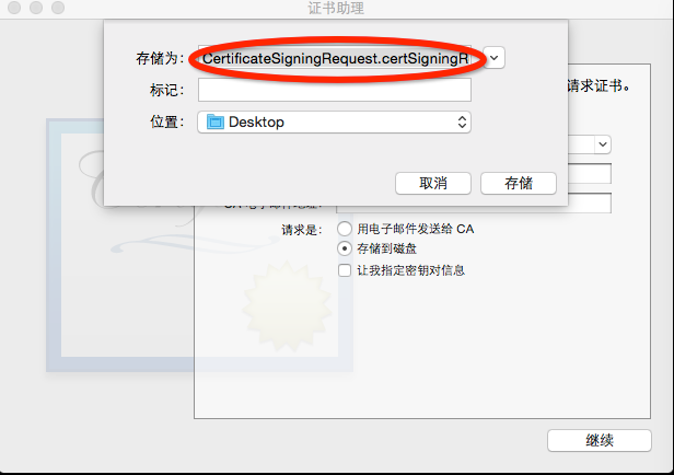 點擊存儲,文件名為:CertificateSigningRequest.certSigningRequest 隨後將他放在一個文件夾中我們取名push吧!