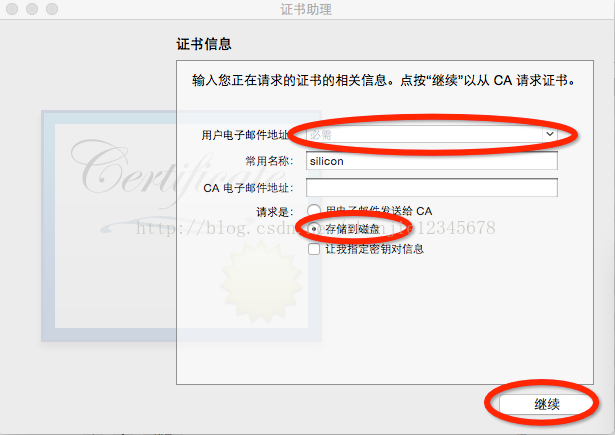 隨後它會彈出一個窗口用戶電子郵件信息就填寫你蘋果開發者賬號的名稱即可(應該是一個郵件名稱),點擊保存到磁盤的選