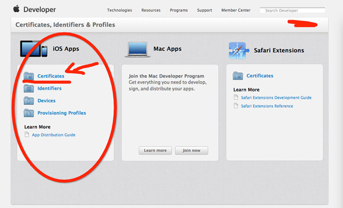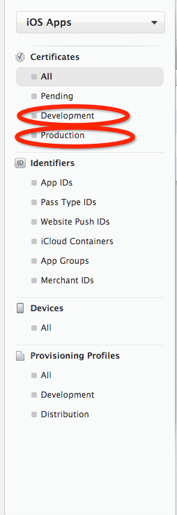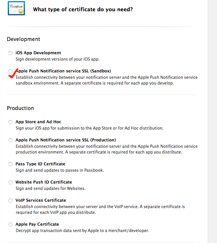 Development選項的作用顧名思義就是用來作為開發使用的證書,Production選項則是用來發布產品使用的,名稱很陌生是不是,之前的開發者網頁是沒有這一選項的,可能是蘋果把他修改了,用這個名稱更加能讓人理解吧(字面上解釋就是產品麼)。兩個選項生成證書的步驟是一樣的,現在我們使用開發者的選項進行證書的制作,步驟如下:選擇Development選項: