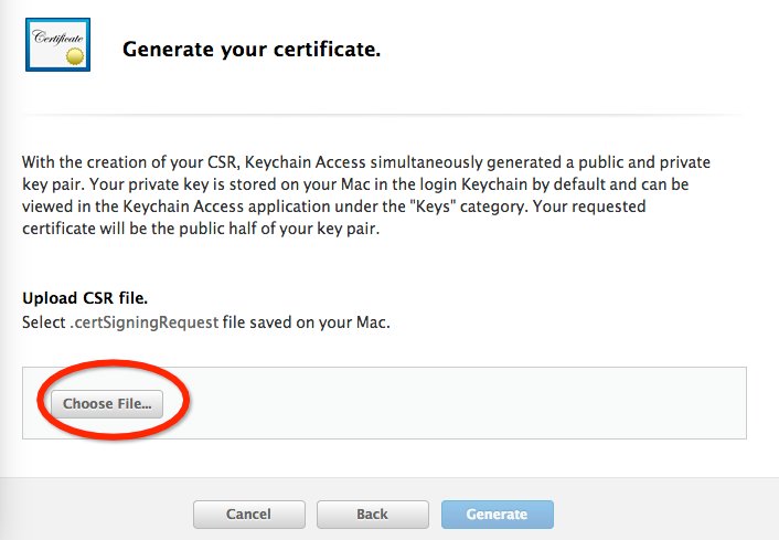 這邊就要選擇在鑰匙串訪問環節下載下來的CertificateSigningRequest.certSigningRequest文件了,選擇並生成: