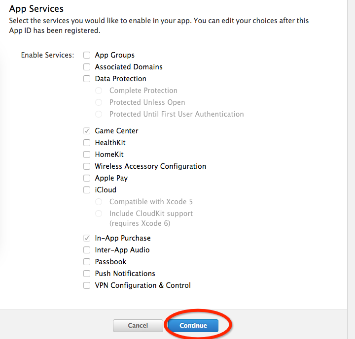 接下來就是對你的應用需要使用蘋果的哪些服務進行選擇就行了,例如廣告,游戲中心,推送,付費等等情況。