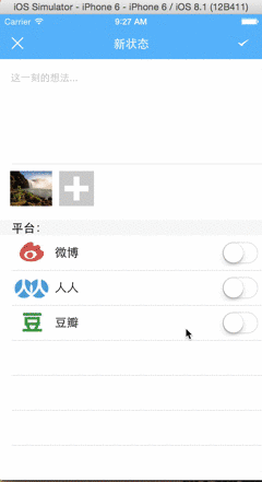 主要是使用UICollectionView來動態加載分享圖片內容,配合預覽頁面,實現動態添加和預覽刪除圖片效果。