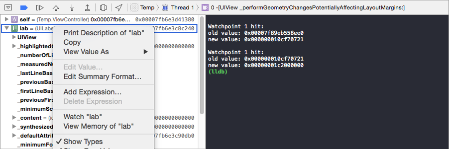 這裡我監視了lab這個UILabel的變量,每當這個變量進行更新它的信息就會被打印到控制台。