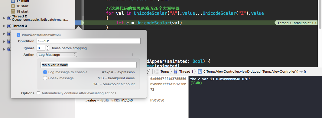 這樣只有遍歷到c==“H”的時候 斷點才會被觸發。