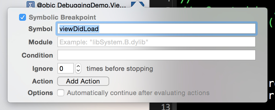 當然,我們也可以僅僅為特定的某個類的方法添加斷點。在 Symbol 一欄輸入 [ClassName viewDidLoad] (Objective-C) 或 ClassName.viewDidLoad (Swift) 即可。
