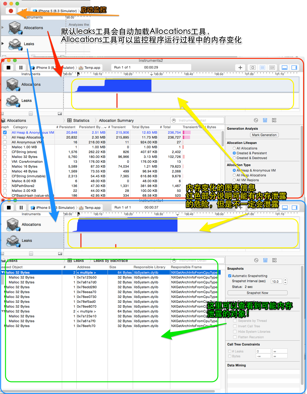 我們繼續回來使用leaks!如果analyze都通過了,那麼就可以使用leaks工具,發現千年老妖級別的側漏了!