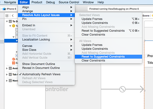 暫停應用程序調試並在左側選中Main.Storyboard來修復問題。點擊表視圖並選中Editor > Resolve Auto Layout Issues > Reset to Suggested Constraints.