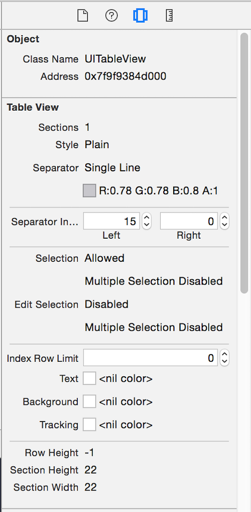 選中後,Xcode會高亮該視圖,並在會在右邊展示Object 和Size檢查器。查看在跳轉欄頂部並確認UITableView是右邊最後一個項目。