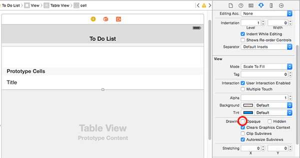 打開Main.storyboard並選中To Do list Scene中的表視圖單元格屬性。在屬性檢查器(Attributes Inspector)中,向下滾動Drawing分區並勾選Opaque。