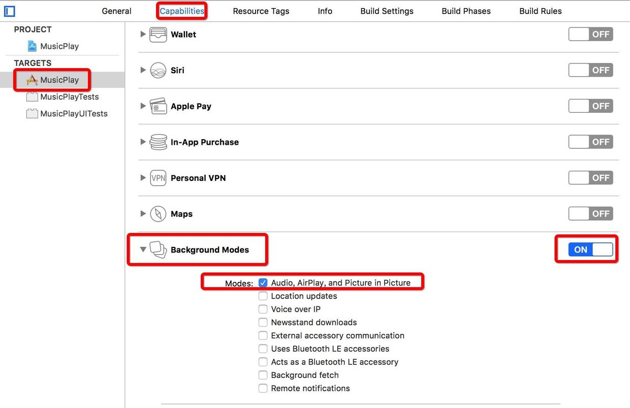 target ->capabilities-> Background modes ->打開開關 ->勾選第一個選項