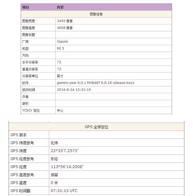 在某Exif查看器上對手機拍攝的照片進行了試驗,結果顯示只要圖片未被壓縮,日期時間、拍照設備型號、像素以及光圈快門等信息都能記錄下來,而位置信息則需要用戶打開GPS才能展現出來。