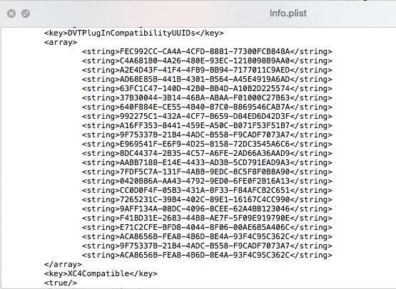 從上圖可以看到DVTPlugInCompatibilityUUIDs數組,這個數組包含了插件所兼容的Xcode的DVTPlugInCompatibilityUUID列表,每個版本的Xcode的DVTPlugInCompatibilityUUID 都是不同的,Xcode更新之後,插件並不會自動更新這個數組,導致插件失效,所以我們把最新版Xcode的DVTPlugInCompatibilityUUID添加進這個數組即可。