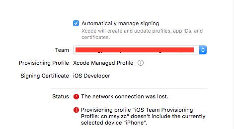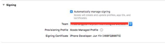 用Xcode8打開工程後,比較明顯的就是下圖了,這個是蘋果的新特性,可以幫助我們自動管理證書。建議大家勾選這個Automatically manage signing(Ps.但是在beat2版本我用的時候,完全不可以,GM版本竟然神奇的又好了。)