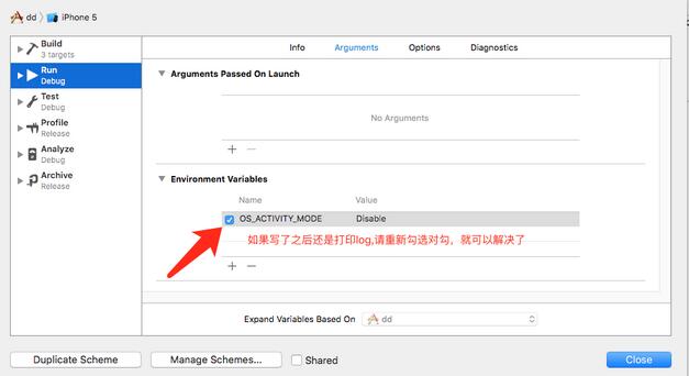 Xcode8裡邊 Edit Scheme-> Run -> Arguments, 在Environment Variables裡邊添加