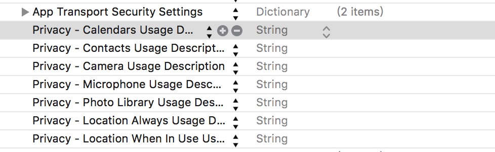 我們需要打開info.plist文件添加相應權限的說明,否則程序在iOS10上會出現崩潰。注意,添加的時候,末尾不要有空格.