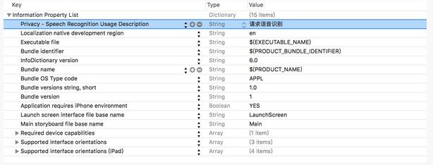 開發者若要在自己的App中使用語音識別功能,需要獲取用戶的同意。首先需要在工程的Info.plist文件中添加一個Privacy-Speech Recognition Usage Description鍵,其實需要對應一個String類型的值,這個值將會在系統獲取權限的警告框中顯示,Info.plist文件如下圖所示: