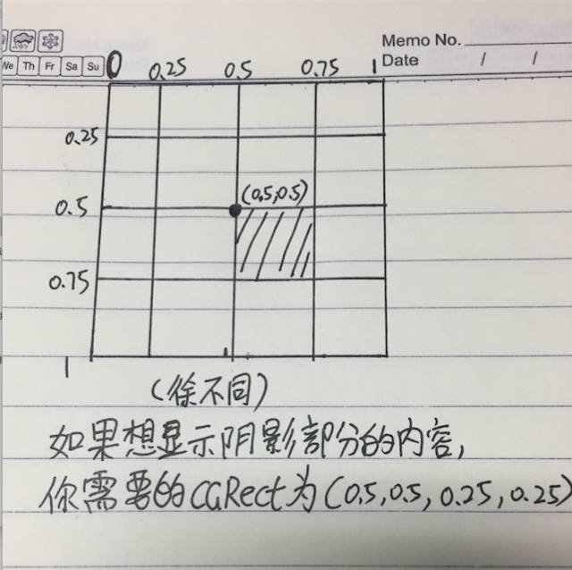 整張圖被分割了,整體比例為1,如果想得到圖中陰影面積,就需要寫的CGRect(0.5,0.5,0.25,0.25),意思是,從(0.5,0.5)為原點,面積為(0.25,0.25),大家可以理解成,即下面的方法。
