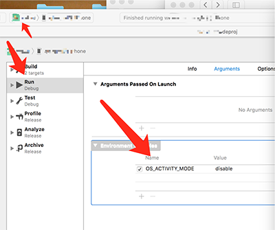 3 xcode 8運行打印一堆沒用的東西Xcode 8的問題,解決辦法是設置OS_ACTIVITY_MODE : disable如下圖:
