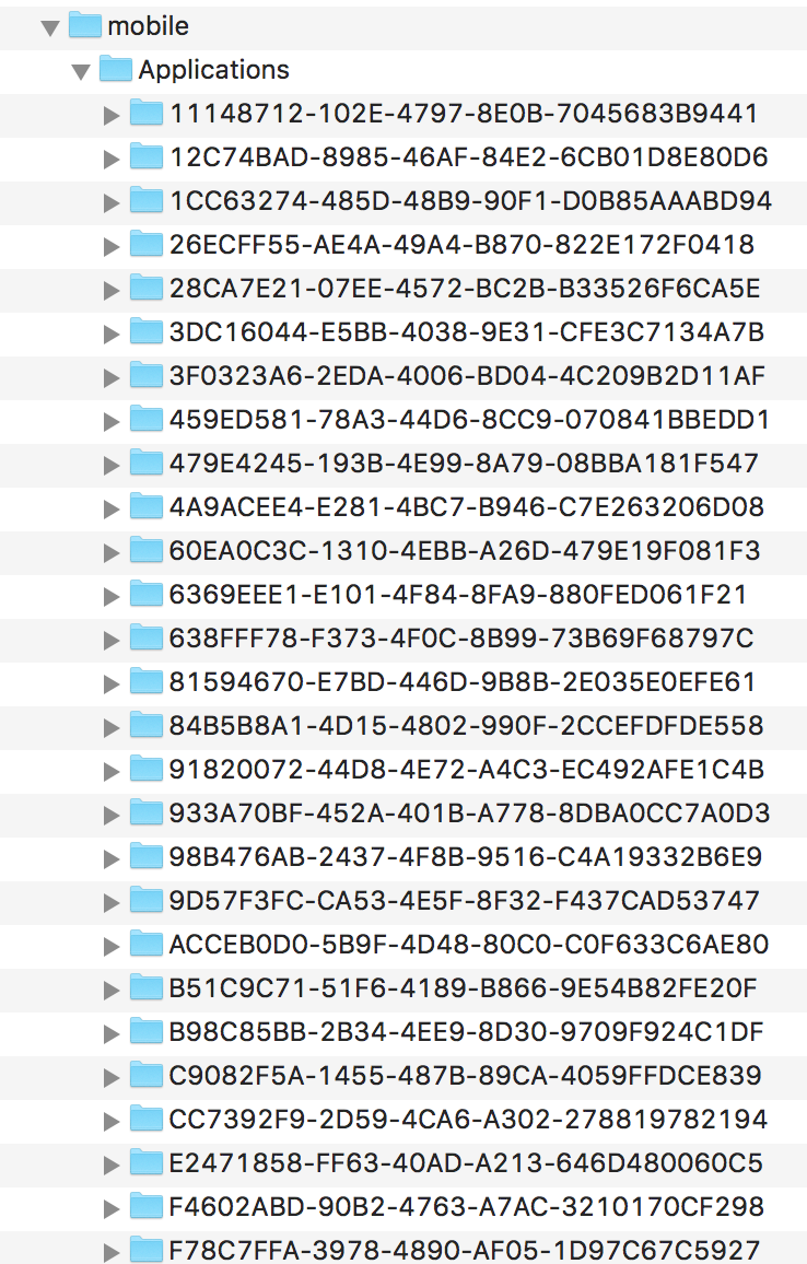 接下來就是要在越獄手機上尋找要“砸殼”的app路徑了,首先使用ssh連接到你的越獄設備,然後在越獄設備中打開你要砸殼的App, 此處我們以微信為例。從AippStore中下載安裝的應用都會位於/var/mobile/Applications中,下方的截圖就是我手機上從AppStore中下載的應用的安裝路徑。當然,下方是使用iExplore工具進行查看的,下方內容中,文件的拷貝我們都會用到iExplorer,當然你也可以使用之前提到過的iFunBox。