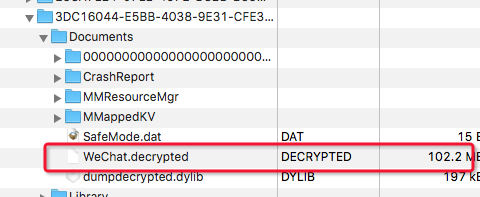 砸殼過程完成後,會在我們的Document目錄下生成一個WeChat.decrypted文件,如下截圖所示。該文件就是脫殼後的文件,我們可以將該文件拷貝到我們的Mac上,以備使用。