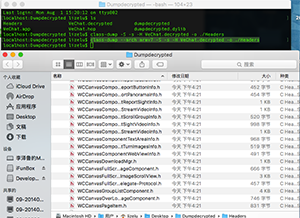 將上面生成的WeChat.decrypted脫殼文件拷貝的我們的Mac上,接下來就是我們class-dump出廠的時刻了。接下來我們要使用class-dump導出該脫殼文件的所有頭文件。具體步驟如下所示。