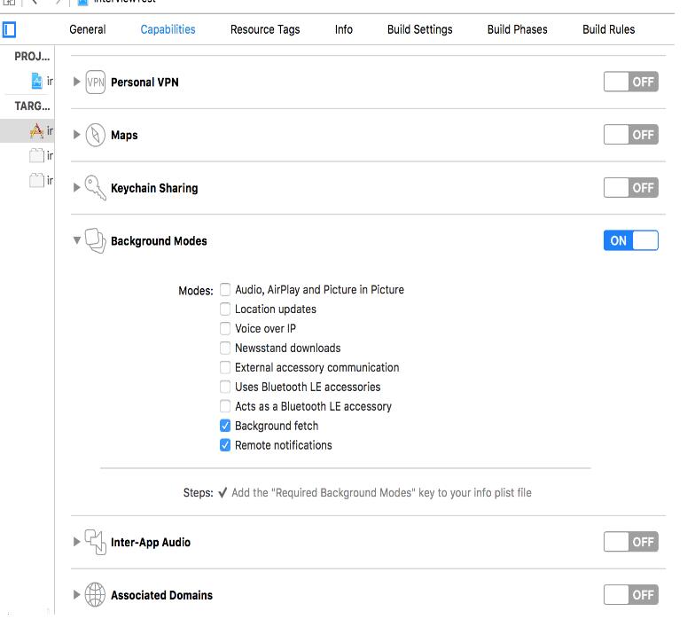 解決方法:PORJECT --> Capabilities --> Background Modes --> Background fetch & Remote notifications -->選中為on 狀態