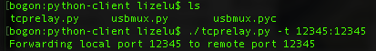 和第一部分中的內容相同,我們使用usbmuxd進行端口的轉發,將上述的“12345”端口對接到Mac本地的某個端口,此處我們使用“12345”端口。進入到usbmuxd-1.0.8目錄下的python-client下執行下方的命令。