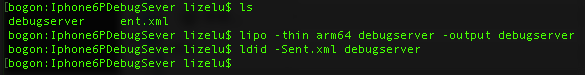 在給debugserver符權限時,我們需要使用到ldid命令,如果你的Mac上沒有安裝ldid命令,那麼請用brew進行install。執行下方的命令行就可以給我們的debugserver賦上task_for_pid權限。需要注意的是-S與ent.xml文件名中是沒有空格的。