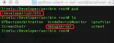進入到到Mac中debugserver所在的目錄下執行上述命令即可,-thin後方填寫你的測試機相應的ARM架構即可,因為我的測試機是iPhone 6 Plus, 是arm64的架構,所以此處填的參數是arm64, 如果你的是iPhone5的設備,那麼就是armv7s了。