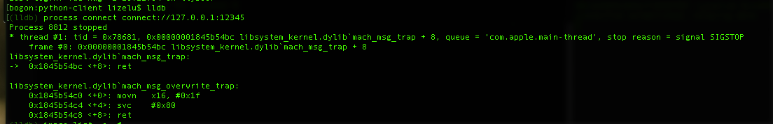 進行端口轉發後,接下來我們就開始進入lldb模式,然後進行debugserver的連接了。首先在terminal上輸入lldb命令,然後輸入下方的地址進行連接。因為我們使用usbmuxd進行了端口的轉發,因此可以使用本地的環回測試地址來進行debugserver的連接。