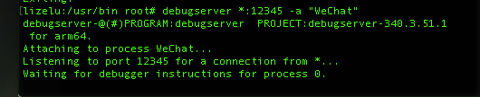 在越獄設備中,我們就可以通過下方命令行來開啟debugserver了,我們此處以調試微信App為例。下方的命令就是啟動debugserver來監聽來自任何IP地址的接入,iOS設備的接入端口是12345,所要調試的App為“WeChat”。命令如下: