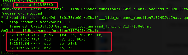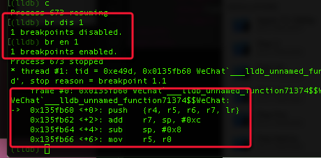 使用下述命令,給上述地址添加斷點。斷點添加後,點擊登錄按鈕就會跳轉到“手機號登錄”頁面就會執行該斷點,下方截圖的紅框中就是“斷點”執行後的效果。從下方截圖中我們可以看出該斷點的編號是1,Breakpoint後方就是斷點編號,該編號會在操作斷點是會用到,下方會給出實例。