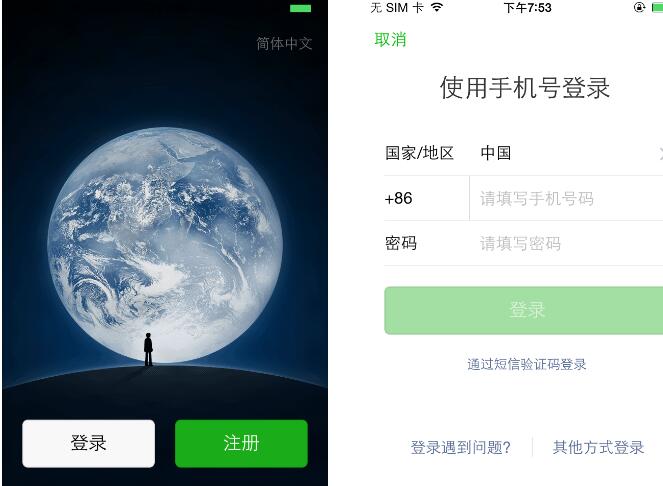 “斷點”這個東西在iOS開發中可謂是經常使用的東西,接下來我們要做的就是給在微信點擊登錄進行頁面跳轉時添加一個斷點。就是點擊左邊截圖的登錄按鈕往右邊頁面跳轉時添加一個斷點。我們暫且將斷點添加在右邊頁面的初始化方法中。