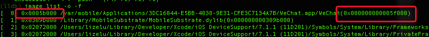 LLDB連接上debugserver後,我們首先使用下方的命令來查看當前進程中的所有模塊。從這些輸出信息中我們能找到“WeChat”這個進程在虛擬內存相對於模塊基地址的偏移量。
