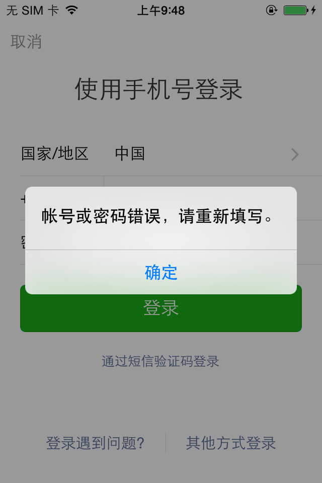 接下來我們要做的事情就是,在比較寄存器r0和r1中的值時我們要改變r1寄存器中的值,然後觀察App的運行效果。下方這個截圖是隨便輸入手機號和密碼時所提示的內容。也就是正常的流程會彈出下方的框。
