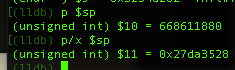 我們還可以將一個地址所存放的值進行打印,下方這個命令就是輸出了$sp指針所指的地址處所存放的值: