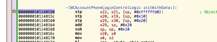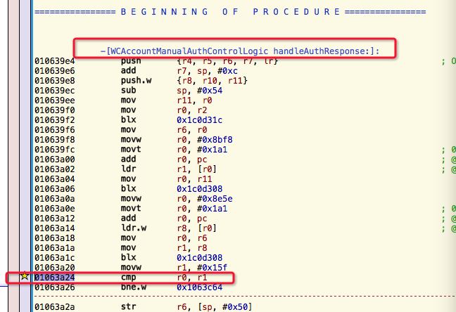 接下來我們將要通過一個實例來實戰一下register write這個命令,通過在Hopper中對登錄模塊的分析,我們不難發現“WCAccountManualAuthControlLogic”這個類中的“handleAuthResponse:”方法就是用來處理“登錄認證響應”的方法。也就是說“handleAuthResponse:”負責處理登錄業務邏輯的網絡響應,並且在這個函數的前邊有一個比較(cmp r0, r1), 根據r0和r1的比較結果來進行跳轉。