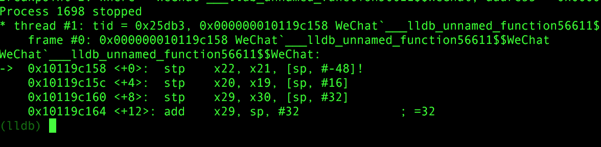 下方是連接後的結果,LLDB與debugserver建立完成後,我們就可以使用lldb來調試微信這個應用了。