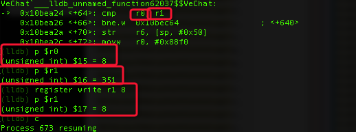 在iOS開發中,我們在使用LLDB調試時,經常會用到po命令來輸出某個變量或者常量的值。在使用LLDB調試WeChat時,我們也可以使用某些命令來輸出寄存器中的值。我們使用$來訪問某個寄存器中的值,並且使用p命令進行打印。下方就是通過p命令將r1寄存器中所存的內容進行打印,在打印之前將$r1進行類型轉換,po命令則輸出了Objective-C的對象,而p輸出的是C語言類型的數據。如下所示:
